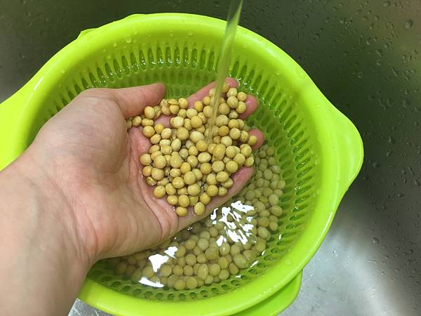 市面上買到的黃豆幾乎都是乾的真空包裝。但是硬的黃豆直接放入果汁幾,除了會讓果汁機更快耗損以外,沒有泡過水的黃豆也不容易磨碎提取水溶性蛋白質,出漿量低,養分也少。如果有泡過水連豆渣在過濾時都會比較細,更好處理!因此如果你沒有太多的時間,至少讓你的豆子泡上2-3小時。Joah抓了250克豆子,家裡隔天有客人,剛好多打一些。