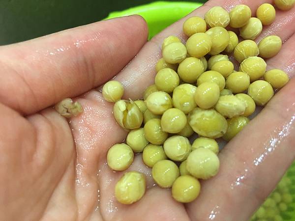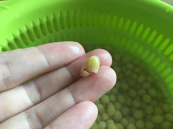 然後再泡久一點,有些黃豆的皮就會像這樣自動脫落,如果尿酸較高的人,建議把黃豆皮去除。因為黃豆含有嘌呤的成份。
