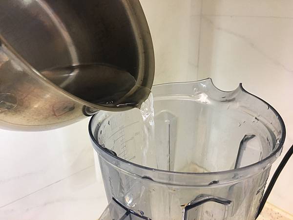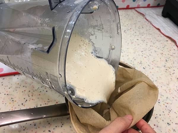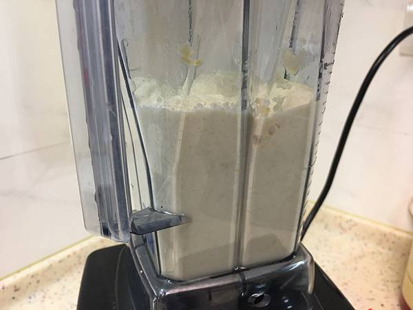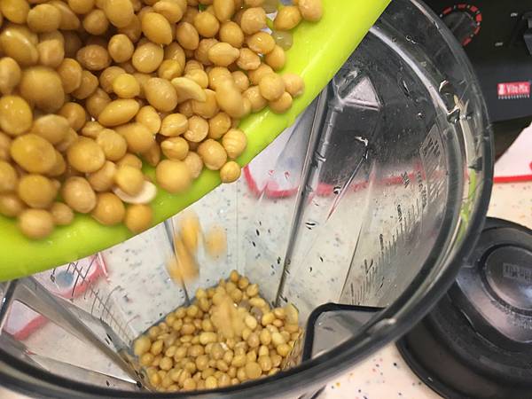 Joah家裡是使用Vita-Mix自動加熱型果汁機,但是其實只要有榨果汁的功能,基本上就能榨豆漿,因為如同Joah說的,果汁機加熱怕假沸的情形,所以最終還是要放到瓦斯爐上會比較保險。將泡好蓬鬆的黃豆放入果汁機內,加入一些水讓它能夠順利攪拌,太濃稠的話果汁機會打不起來的。但是大家要記住加進去的水量,等等再煮的時候黃豆跟水的比例才不會跑掉。