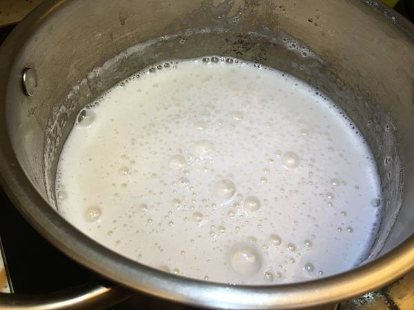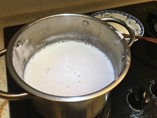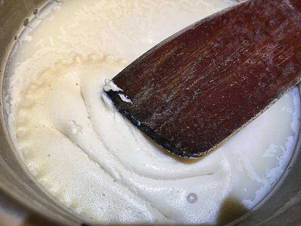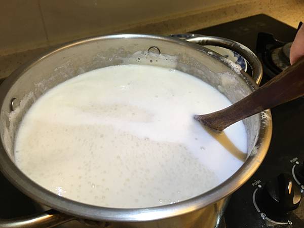 為什麼這步驟要特別拿出來講,因為怕假沸啊!所以Joah特別提醒大家,將豆漿放上瓦斯爐煮時會一直起沫,就是火力越大,泡泡浮的越高,那個就是「沫」,代表裡面還含有皂素的成份,一定要一邊把沫給撈掉,直到看見豆漿本尊為止。